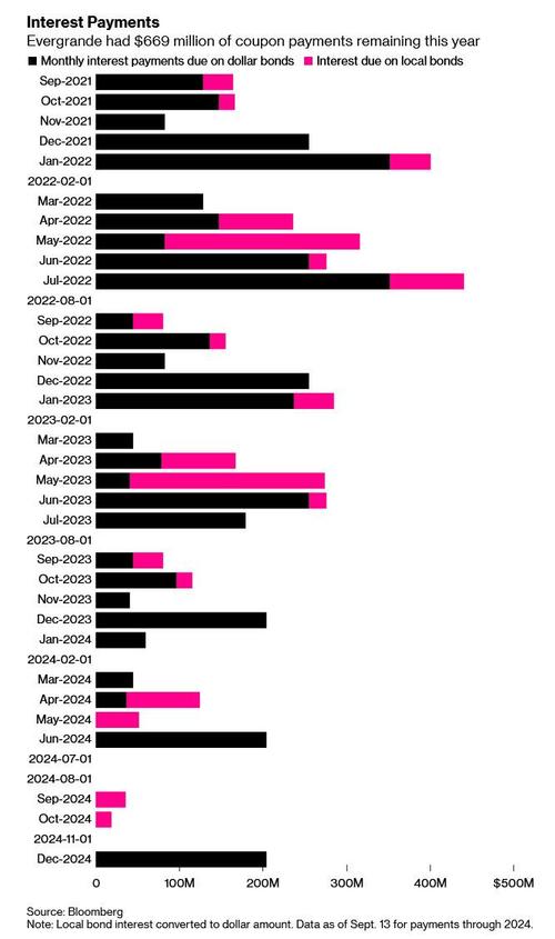 Ponzi schemes collapse when people demand to get paid back for their “investments” but the schemers can’t ensnare enough new investors to fund the previous ones who want out. As Bloomberg reports (see chart below), Evergrande owes $669 million in interest debt payments over the next 3 months.