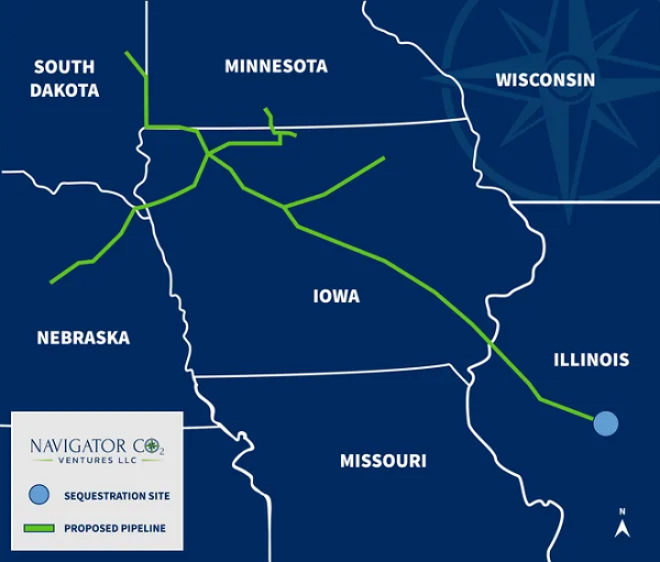 An actual CO2 pipeline is being constructed across five U.S. states to transport liquefied CO2 and bury it underground. The pipeline cross Iowa and has branches in South Dakota, Minnesota, Nebraska and Illinois.