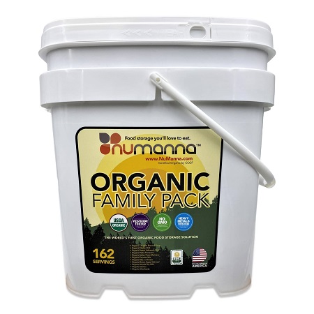The NuManna company sells an organic family pack of storable food labeled the “Organic Family Pack.” (1)